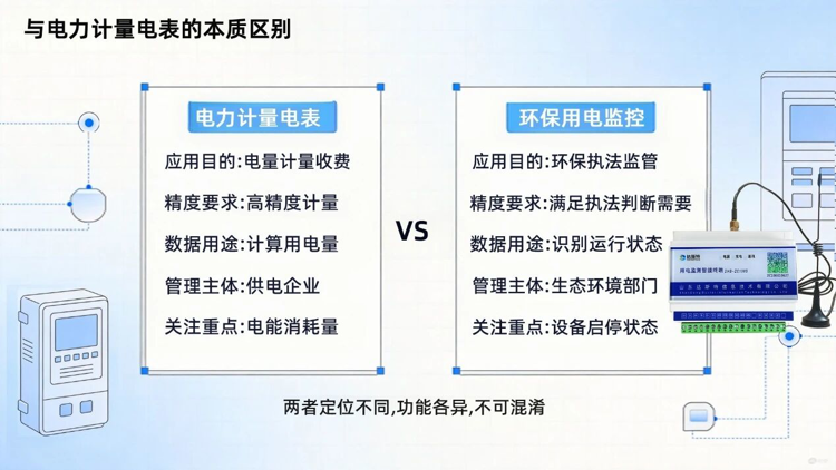 与电力部门安装的计量电表相比,两者在应用目的上存在根本差异。环保用电监控的目的是环保执法监管,而计量电表的目的是电量计量收费;在精度要求上,环保监控只需满足执法判断需要,而计量电表需要高精度计量;在数据用途上,环保监控用于识别运行状态,计量电表用于计算用电量;在管理主体上,环保监控由生态环境部门管理,计量电表由供电企业管理;在关注重点上,环保监控关注设备启停状态,计量电表关注电能消耗量。