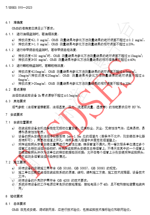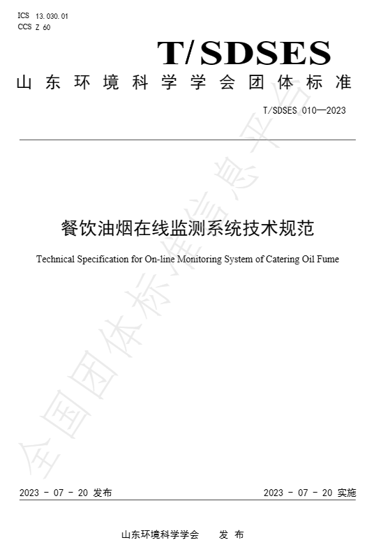 山东环境科学学会于2023年7月20日发布团体标准《餐饮油烟在线监测系统技术规范》(T/SDSES 010-2023)和《餐饮油烟在线监测系统运营维护规范》(T/SDSES 011-2023)。,该两项标准2023年7月20日起实施。
