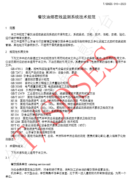 《餐饮油烟在线监测系统技术规范》(T/SDSES 010-2023)