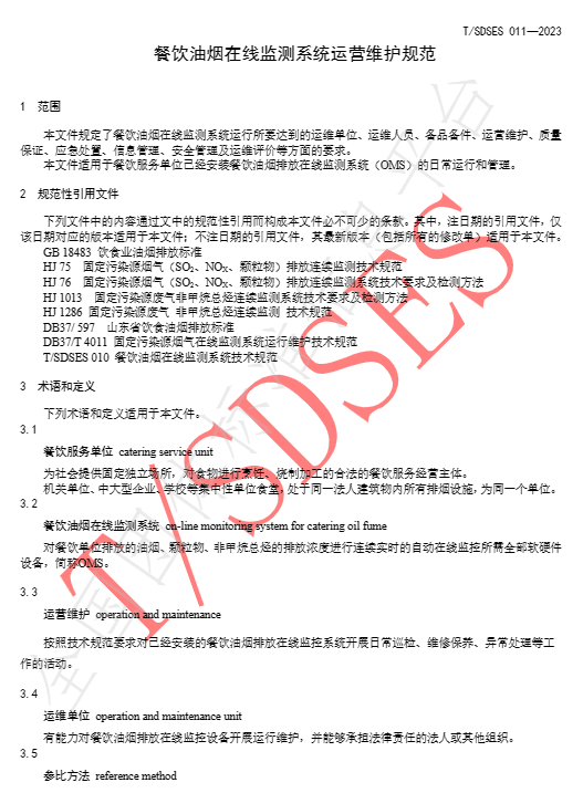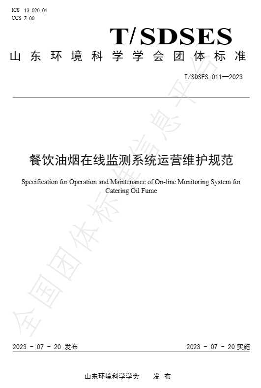 山东环境科学学会于2023年7月20日发布团体标准《餐饮油烟在线监测系统技术规范》(T/SDSES 010-2023)和《餐饮油烟在线监测系统运营维护规范》(T/SDSES 011-2023)。,该两项标准2023年7月20日起实施。