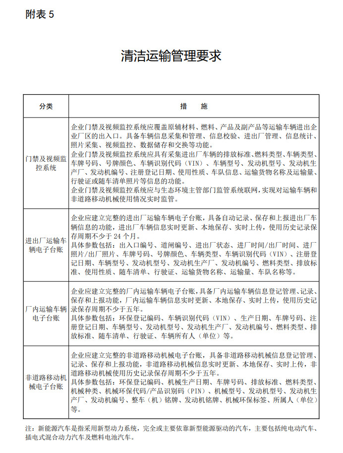(三)清洁运输要求。进出企业物料和产品采用铁路、水路、管道、管状带式输送机、皮带通廊等清洁方式运输比例不低于80%;达不到的企业,汽车运输部分应全部采用新能源或国六排放标准车辆。重点区域企业清洁运输比例达不到80%的部分应用新能源汽车替代,其他运输部分应全部采用新能源或国六排放标准车辆。厂内使用新能源运输车辆(2025年底前可采用国六排放标准的汽车)。非道路移动机械原则上采用新能源,无对应产品的应满足国四及以上排放标准。危化品运输等特种车辆可使用国五及以上排放标准汽车(燃气车辆达到国六排放标准)。