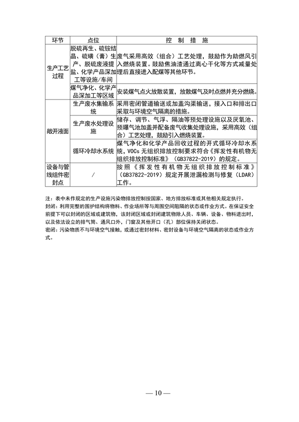 加强VOCs全过程治理。焦炉采取正压密封、砖缝灌浆、陶瓷焊补等源头控制措施减少炉墙串漏。各类储罐(槽、池)以及有机液体装载点位收集的高浓度VOCs废气接入压力平衡系统或燃烧处理;脱硫再生、硫铵结晶、硫磺(膏)生产、脱硫废液提盐、焦油渣干化、生产废水处理、化学产品深加工等设施或车间收集的低浓度VOCs废气采用高效(组合)工艺处理,鼓励引入燃烧装置。