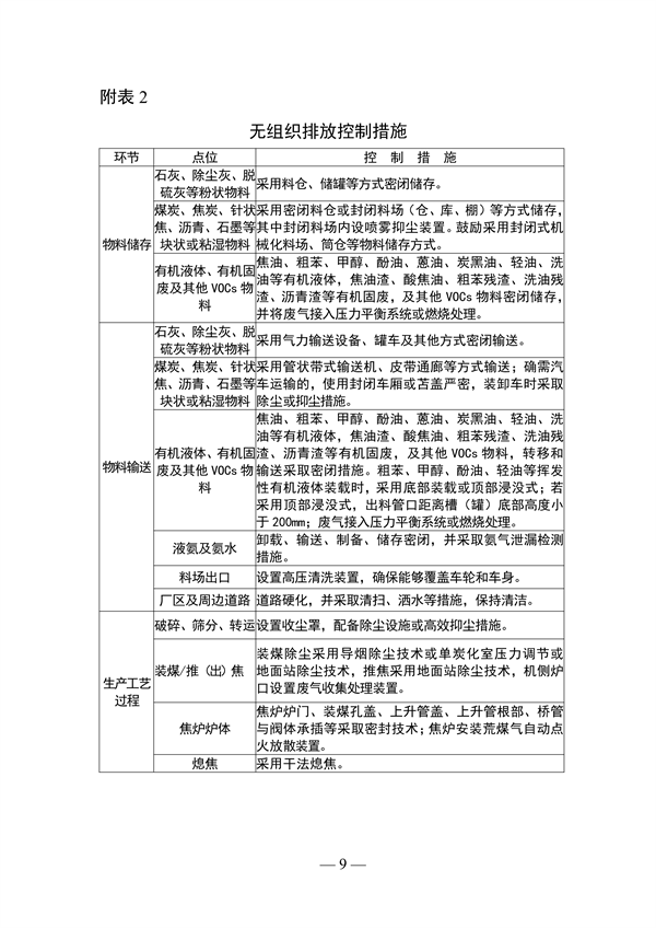 (二)无组织排放改造。物料储存、物料输送、生产工艺过程、敞开液面等无组织排放源,在保障安全生产的前提下,采用密闭、封闭等有效治理措施。产尘点按照“应收尽收”原则合理配置废气收集设施,优化收集风量。石灰、除尘灰、脱硫灰等粉状物料采用料仓、储罐等方式密闭储存,采用气力输送设备、罐车及其他方式密闭输送。煤炭、焦炭、针状焦等块状或粘湿物料采用密闭料仓或封闭料场(仓、库、棚)等方式储存,鼓励采用封闭式机械化料场、筒仓等储存方式,采用管状带式输送机、皮带通廊等方式输送。有机液体、有机固废及其他VOCs物料应密闭储存,转移和输送应采取密闭措施,并将废气接入压力平衡系统或燃烧处理;挥发性有机液体装车采用底部装载或顶部浸没式。液氨及氨水卸载、输送、制备、储存密闭,并采取氨气泄漏检测措施。焦炉炉门、装煤孔盖、上升管盖、上升管根部、桥管与阀体承插等采用密封技术;焦炉安装荒煤气自动点火放散装置。煤气净化、化学产品深加工等区域安装煤气点火放散装置,放散煤气及时点燃并充分燃烧。生产废水集输应采用密闭管道输送,生产废水预处理设施及厌氧池、预曝气池应加盖并配备废气收集处理设施,采用高效(组合)工艺处理。无组织排放控制设施与生产设施同步正常运行,产尘点及生产设施无可见烟粉尘外逸,厂区整洁无积尘、无明显异味。具体要求见附表2。