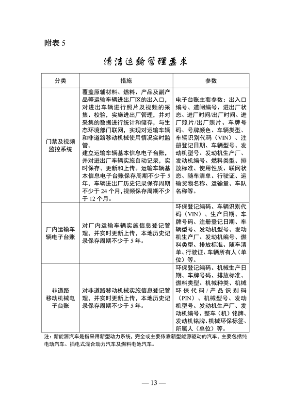 (三)清洁运输改造。煤炭、焦炭等大宗物料和产品中长距离运输优先采用铁路或水路,短途接驳和厂内物料转运优先采用管状带式输送机或皮带通廊。进出厂区物料和产品采用铁路、水路、管道、管状带式输送机、封闭皮带通廊等清洁方式运输比例不低于80%,清洁运输比例达不到80%的部分采用新能源汽车替代(2025年底前新能源汽车替代比例不低于60%),其他运输部分全部采用新能源或国六排放标准车辆。厂区内运输采用新能源车辆(2025年底前可采用国六排放标准的汽车)。非道路移动机械原则上采用新能源,无对应产品的满足国四及以上排放标准(2025年底前可采用国三排放标准非道路移动机械)。危化品运输等特种车辆可采用国五及以上排放标准汽车(燃气车辆达到国六排放标准)。优化厂内总图布置,合理规划物料输送路线,减少厂内物料二次倒运和汽车运输量。