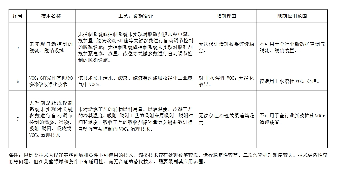 限制类技术为仅在某些领域和条件下可使用的技术。该类技术 存在处理效率较低、运行稳定性较差、二次污染处理难度较大、技术经济性较低等问题,但在某些领域和条件下有适用性、尚无合适的替代技术,需要限制其应用范围。