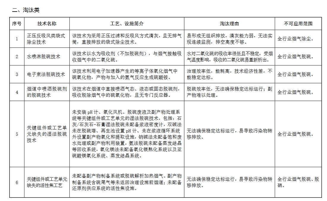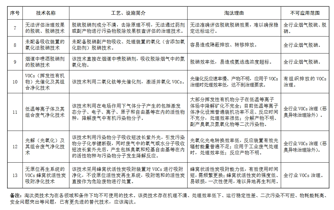 淘汰类技术为在各领域和条件下均不可使用的技术。该类技术 存在机理不清、处理效率低下、运行稳定性差、二次污染不可控、 物耗能耗高、安全问题突出等问题,已有更先进的替代技术,应该淘汰。