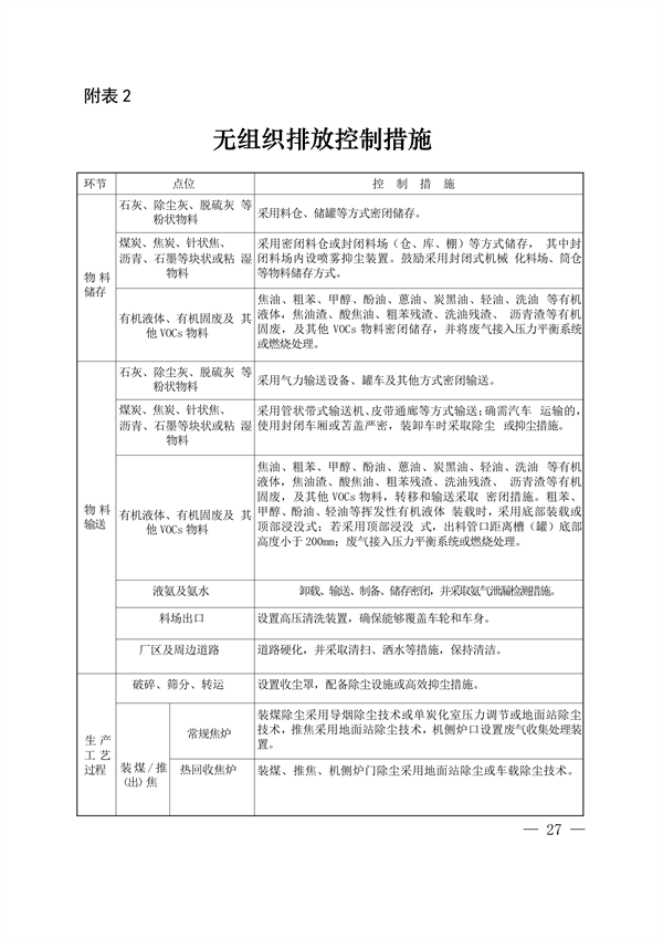 对照《关于推进实施焦化行业超低排放的意见》中关于焦化企业超低排放指标要求,对焦化企业所有生产环节(备煤、炼焦、熄焦、焦处理、煤气净化、化学产品深加工等生产环节,以及物料产品储存运输)实施升级改造,达到相应控制指标和管理要求。具体指标限值和控制措施见附表1-5。