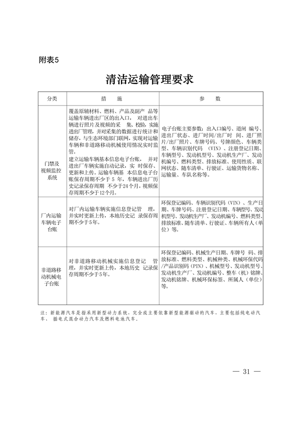物料产品储存运输。进出焦化企业的大宗物料和产品采用铁路、水路、管道或者管状带式输送机等清洁方式运输比例不低于85%;达不到要求的企业,汽车运输部分全部采用新能源。鼓励车辆更新时采用新能源汽车。厂内运输车辆应满足机动车排放标准要求,达不到的要求应及时更新。非道路移动机械原则上采用新能源,无对应产品的满足国四及以上排放标准(2025年底前可采用国三排放标准非道路移动机械)。危化品运输等特种车辆可采用国五及以上排放标准车辆(燃气车辆达到国六排放标准)。