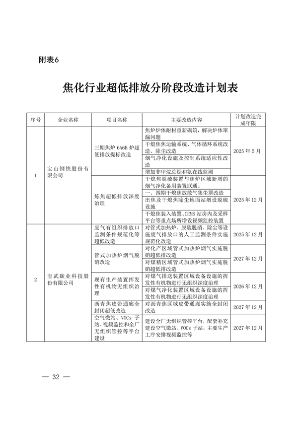大气污染物有组织排放控制。对照焦化行业超低排放改造要求,因厂施策,按照时间服从质量原则,稳步推进改造项目实施。已完成超低排放改造的钢焦联合企业,要对标对表、查缺补漏,实施超低改造。2024年底前,宝武碳业完成煤气精制、化学产品深加工生产环节工序焦化企业有组织超低排放预评估工作,对标对表完成有组织焦化超低排放改造项目清单确定、明确改造技术路线。2025年底前,宝钢股份完成三期焦炉6A6B炉超低排放提标改造和炼焦超低排放深度治理,备煤、炼焦、熄焦、焦处理等生产环节全面实现超低排放;宝武碳业完成现有管式加热炉烟气脱硫脱硝60%改造任务,完成废气有组织排放口监测条件规范化等超低排放改造。2027年底前,宝武碳业完成管式加热炉安装在线监控等所有有组织超低排改造。