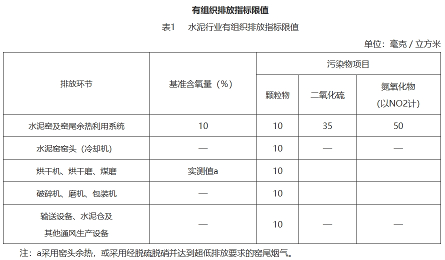 水泥企业在基准含氧量10%的条件下,水泥窑及窑尾余热利用系统废气颗粒物、二氧化硫、氮氧化物排放浓度小时均值分别不高于10mg/m3、35mg/m3、50mg/m3。