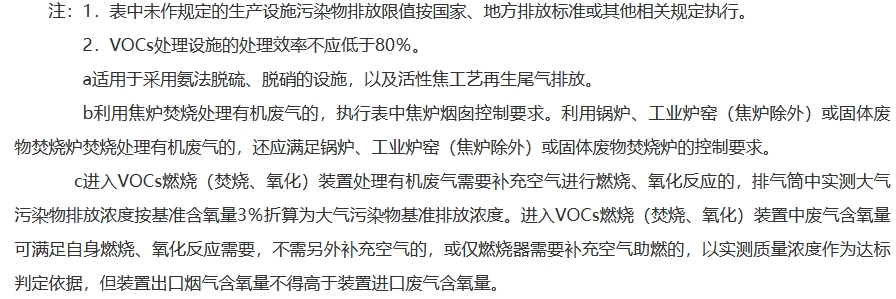 焦化企业在基准含氧量8%的条件下,焦炉烟囱废气颗粒物、二氧化硫、氮氧化物、非甲烷总烃、氨排放浓度小时均值分别不高于10mg/m3、30mg/m3、150mg/m3、100mg/m3、8mg/m3;生产废水处理设施非甲烷总烃浓度小时均值不高于100mg/m3。其他污染源颗粒物排放浓度小时均值不高于10mg/m3。
