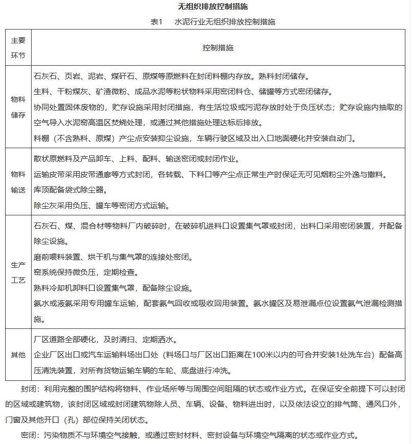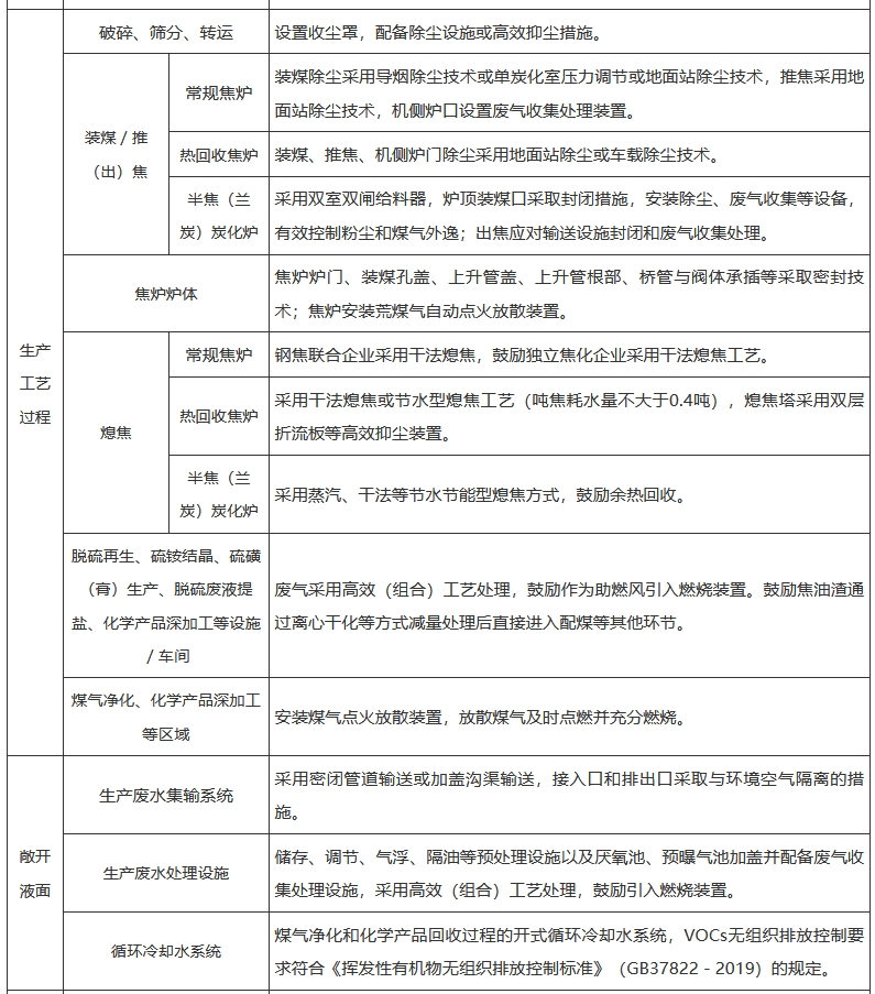 水泥和焦化企业超低排放是指所有生产环节(水泥企业包括破碎、粉磨、配料、熟料煅烧、烘干、协同处置等,以及原燃料和产品储存运输。焦化企业包括备煤、炼焦、熄焦、焦处理、煤气净化、化学产品深加工等生产环节,以及物料产品储存运输)的大气污染物有组织、无组织排放及运输过程达到超低排放要求。控制指标和措施要求如下。