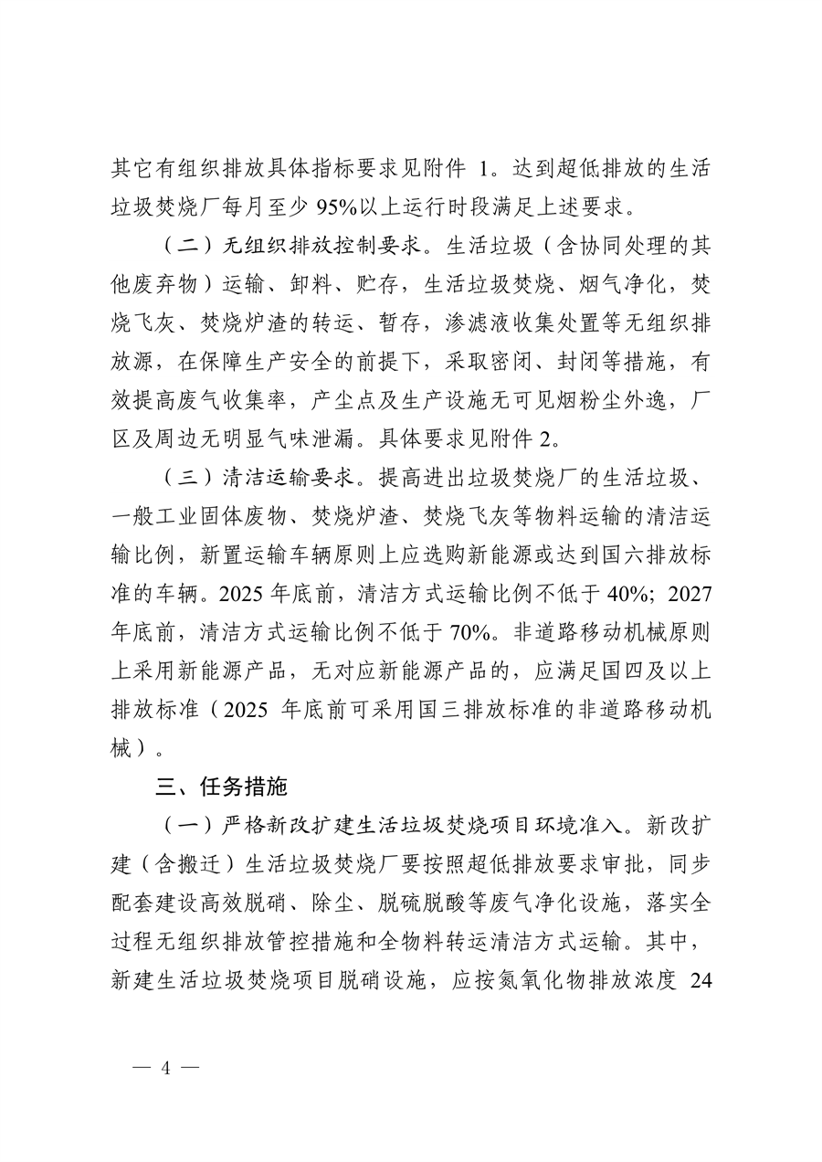 提出了5方面重点治理任务,包括:严格新改扩建生活垃圾焚烧项目环境准入、高质量推进超低排放改造、加快推进垃圾焚烧行业转型升级、鼓励协同开展减污降碳、强化全过程精细化环境管理。对新建生活垃圾焚烧项目脱硝设施,要求氮氧化物排放浓度24小时均值不高于50毫克/立方米进行设计,高于现有企业80毫克/立方米的改造要求。