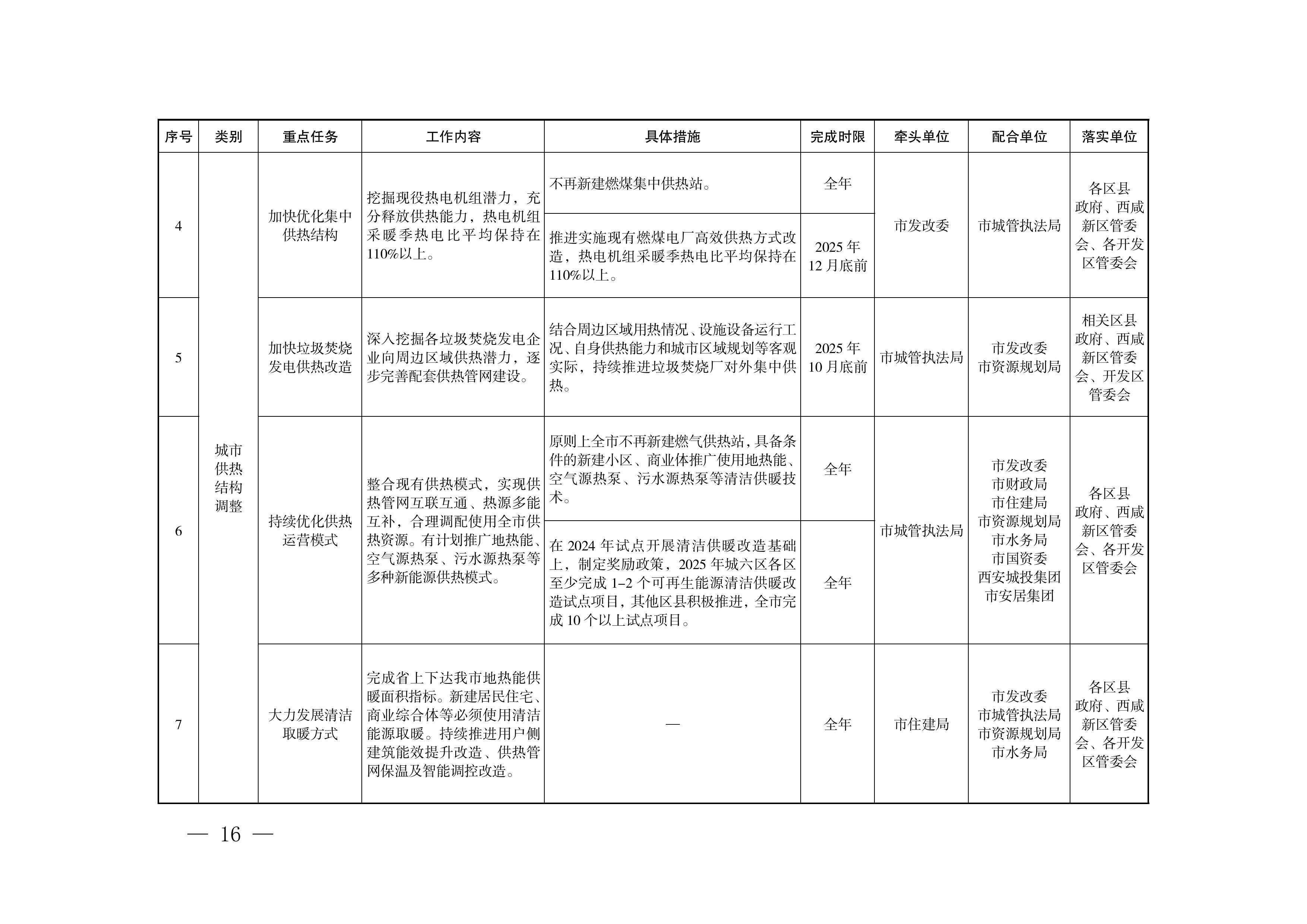 (3)持续优化供热运营模式。整合现有供热模式,实现供热管网互联互通、热源多能互补,有计划推广地热能、空气源热泵、污水源热泵等多种新能源供热模式。(市城管执法局牵头,市发改委、市财政局、市住建局、市资源规划局、市水务局、市国资委、西安城投集团、市安居集团配合)