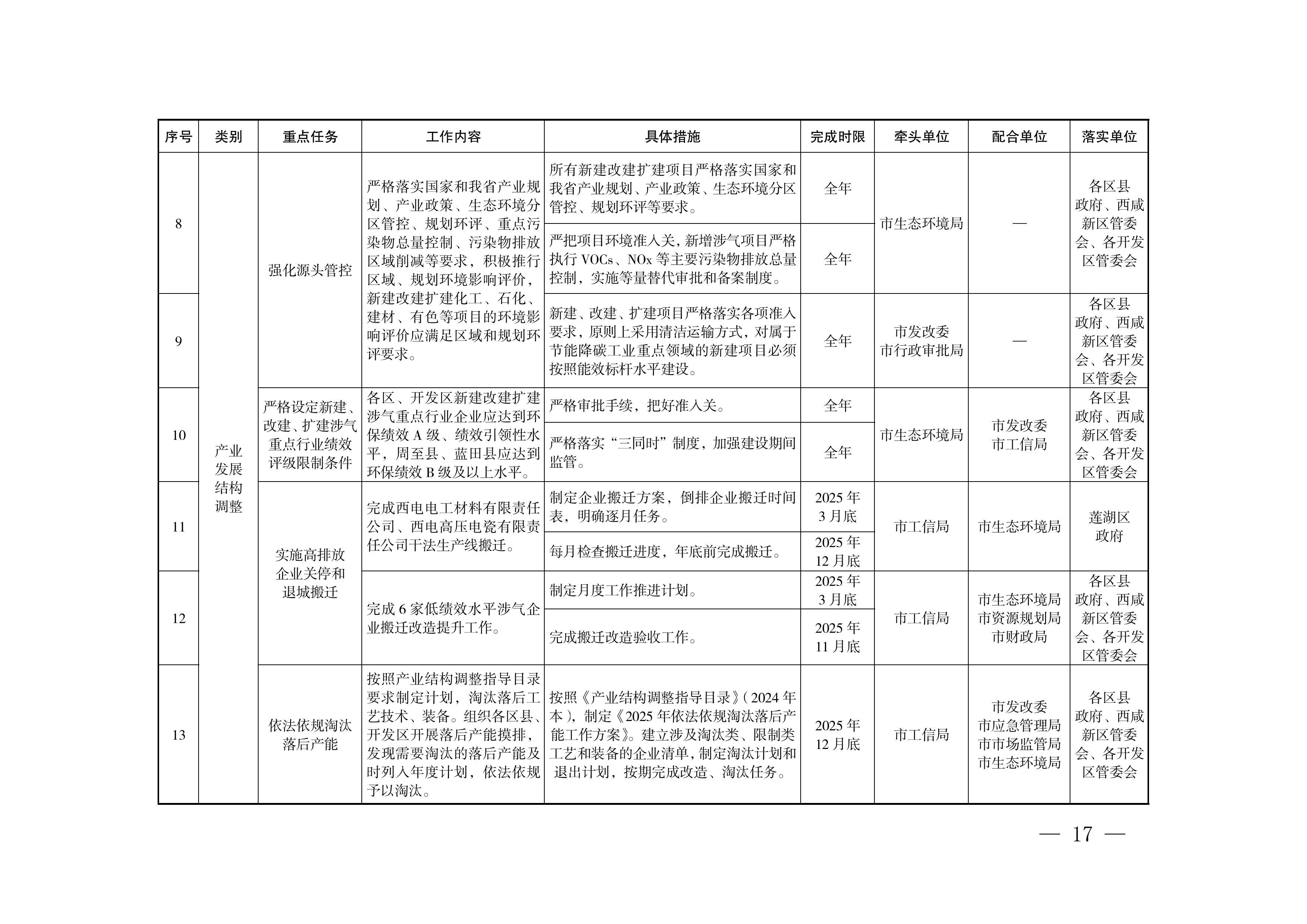(六)加强组织实施。方案实施过程中要坚持依法行政,防范化解风险,确保平稳有序。本方案自印发之日起一个月内,各区县、开发区要出台本辖区实施方案。(市生态环境局牵头,市级相关部门配合)