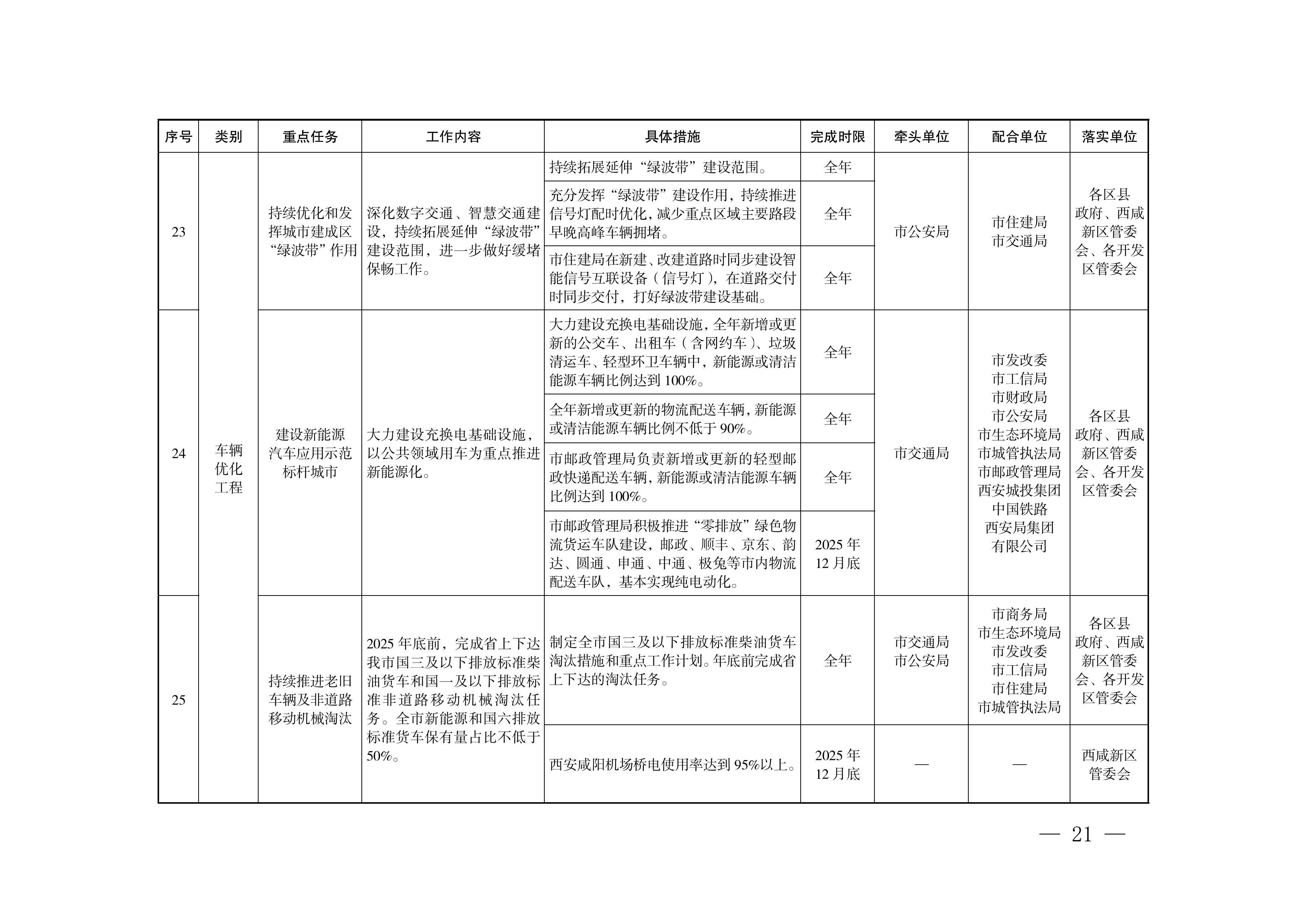 (2)建设新能源汽车应用示范标杆城市。大力建设充换电基础设施,以公共领域用车为重点推进新能源化。(市交通局牵头,市发改委、市工信局、市财政局、市公安局、市生态环境局、市城管执法局、市邮政管理局、西安城投集团、中国铁路西安局集团有限公司配合)
