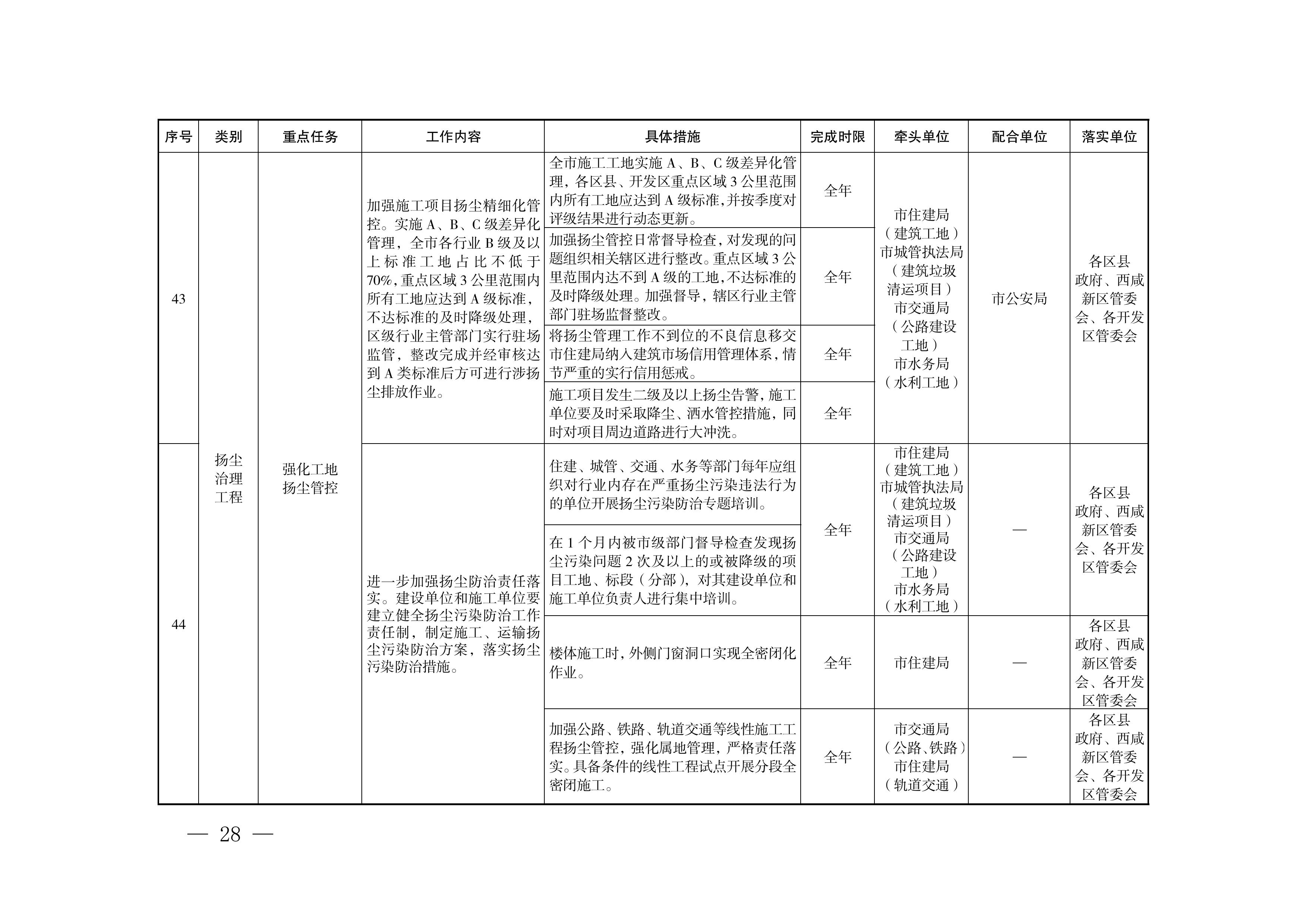(3)强化工地扬尘管控。加强施工项目扬尘精细化管控,实施A、B、C级差异化管理。持续强化施工工地扬尘监测信息化管控,加大惩处力度。每年组织对行业内存在严重扬尘污染违法行为的单位开展扬尘污染防治专题培训。(市住建局负责建筑工地、市城管执法局负责建筑垃圾清运项目、市交通局负责公路建设工地、市水务局负责水利工地、市生态环境局负责扬尘监测)