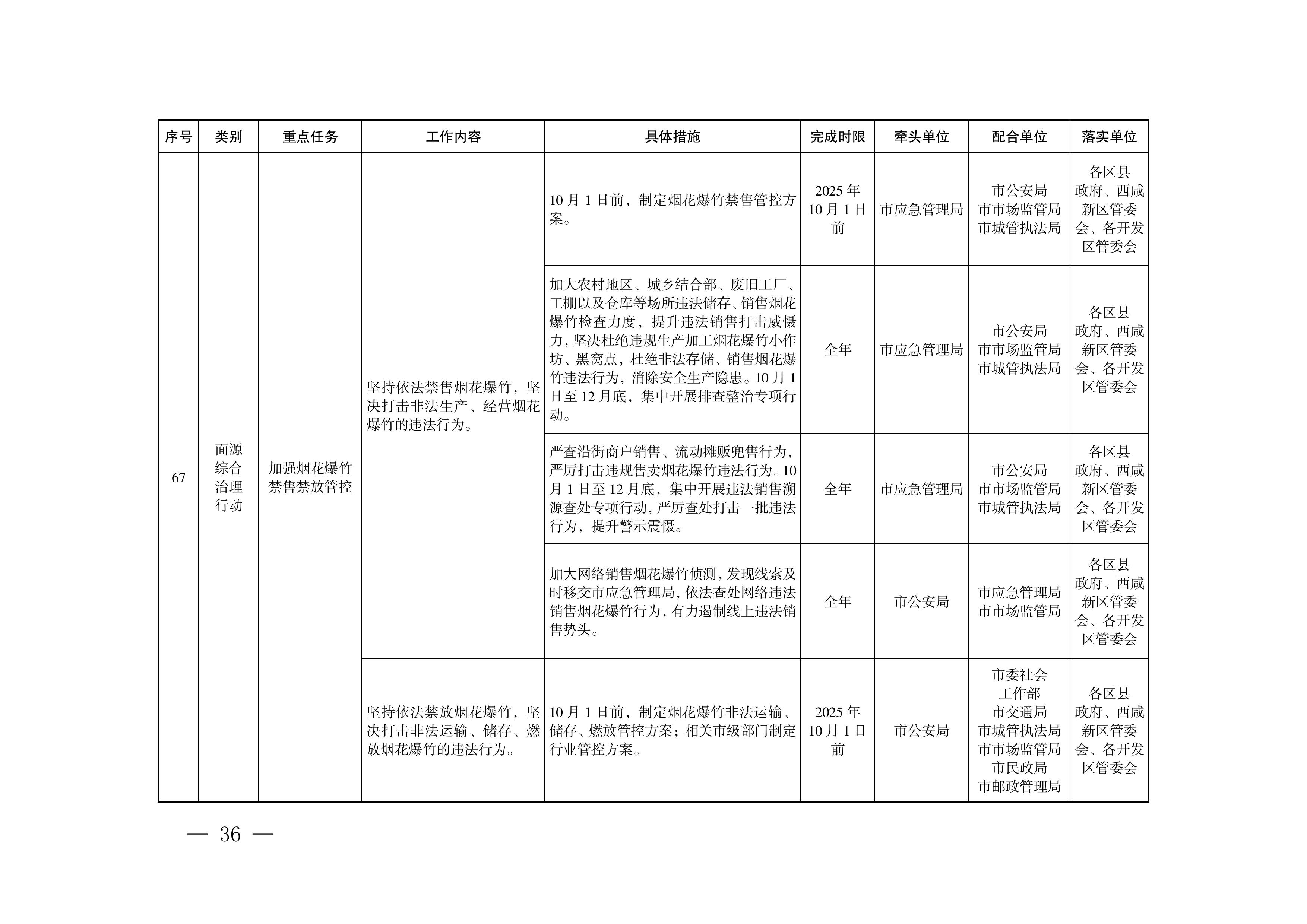 加大网络销售烟花爆竹侦测,发现线索及时移交应急管理部门,依法查处网络违法销售烟花爆竹行为,有力遏制线上违法销售势头。坚持依法禁放烟花爆竹,坚决打击非法运输、储存、燃放烟花爆竹的违法行为。(市公安局牵头,市应急管理局、市交通局、市市场监管局、市城管执法局、市生态环境局、市邮政管理局配合)