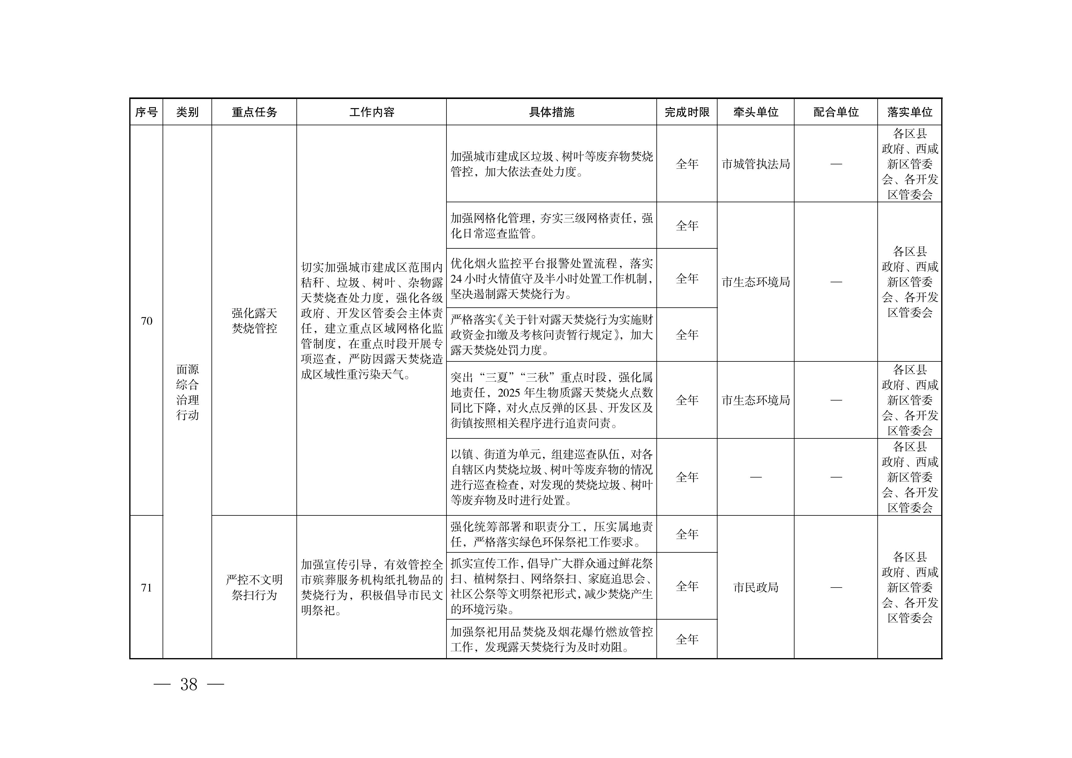 (5)强化露天焚烧管控。切实加强城市建成区范围内秸秆、垃圾、树叶、杂物等露天焚烧查处力度,严防因露天焚烧造成区域性重污染天气。(市城管执法局牵头)