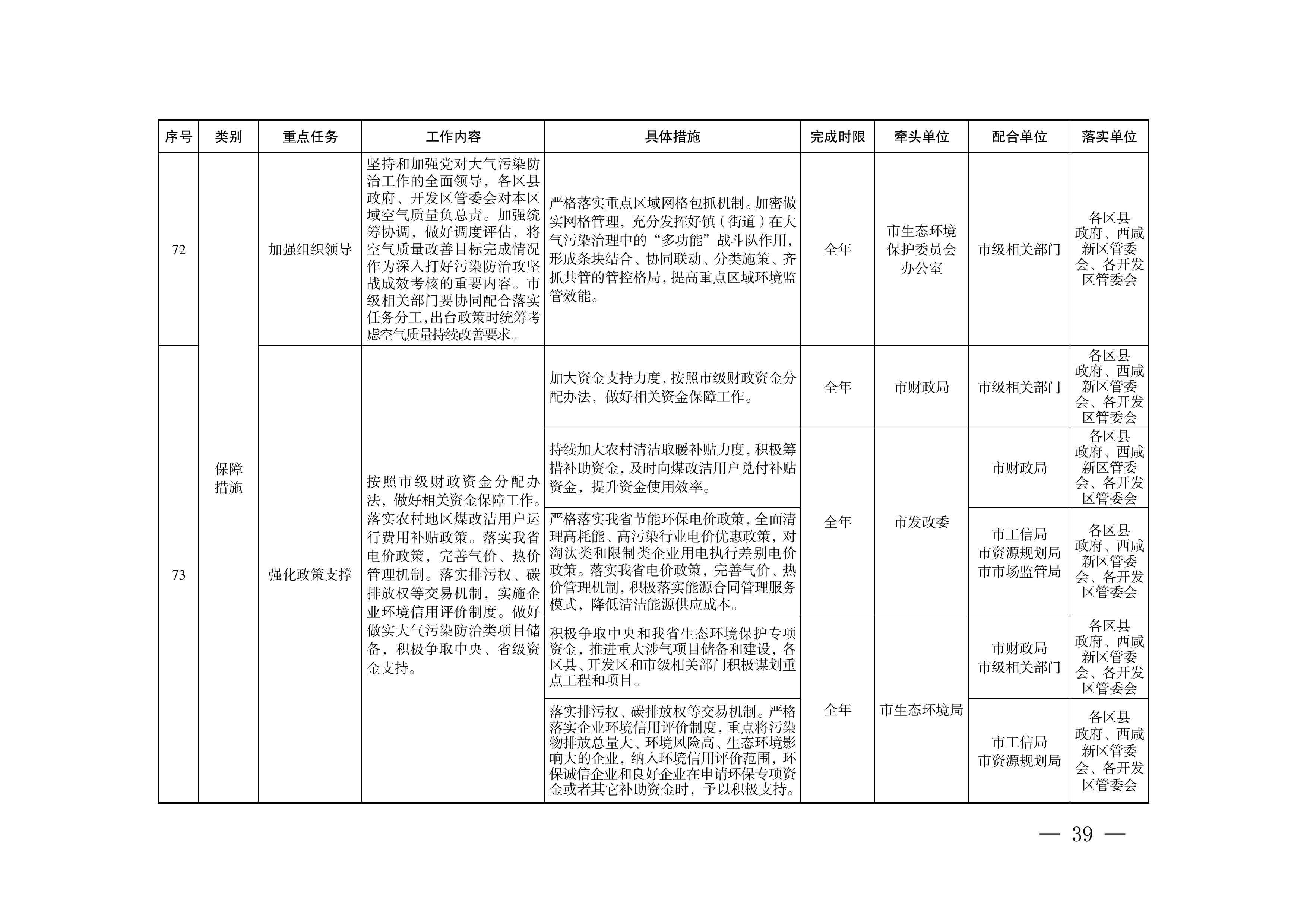 (二)强化政策支撑。按照市级财政资金分配办法,做好相关资金保障工作。落实农村地区煤改洁用户运行费用补贴政策。落实我省电价政策,完善气价、热价管理机制。落实排污权、碳排放权等交易机制,实施企业环境信用评价制度;做好做实大气污染防治类项目储备,积极争取中央、省级资金支持。(市财政局、市发改委、市生态环境局按职责分工负责)