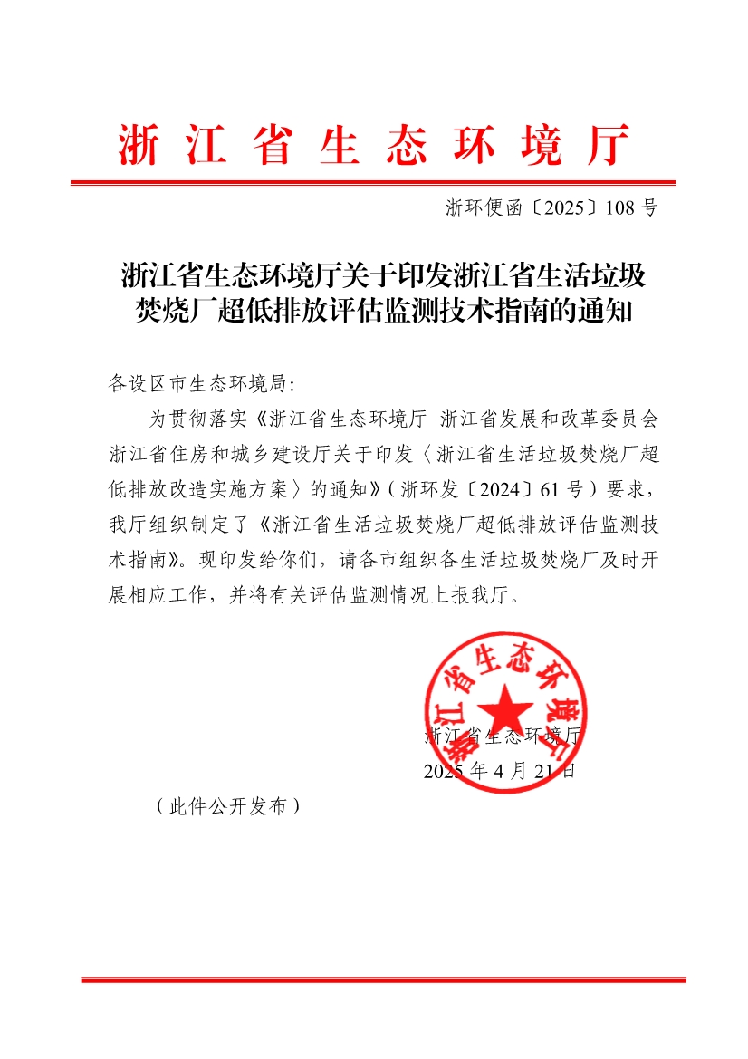 4月23日,浙江省生态环境厅印发《浙江省生活垃圾焚烧厂超低排放评估监测技术指南》。
