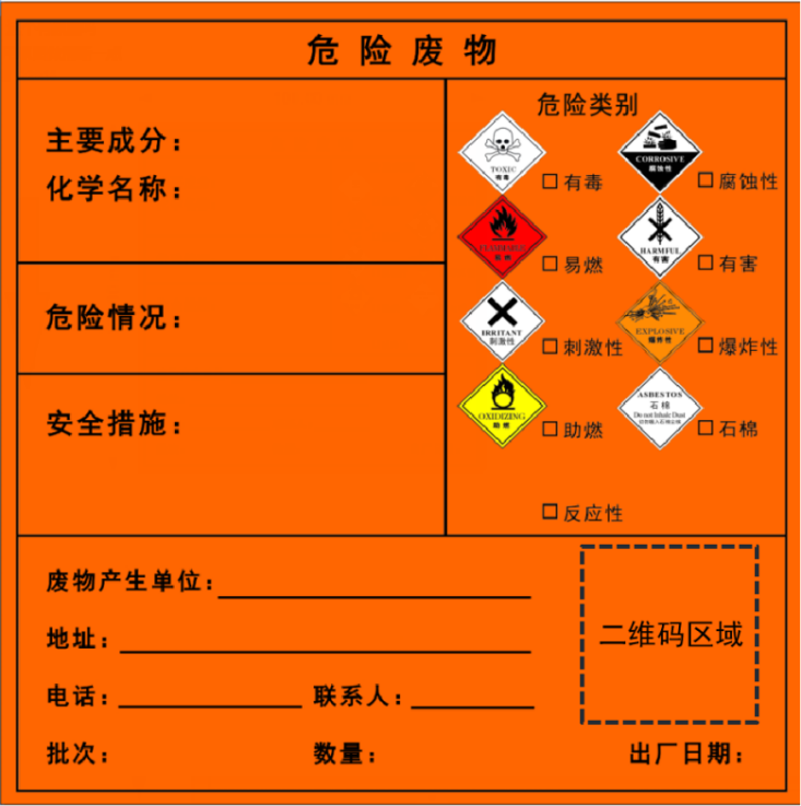 3.标签样式要求:危险废物标签应符合《危险废物贮存污染控制标准》(GB18597-2001)要求,背景色为醒目的橘黄色,字体为黑体字,字体颜色为黑色,标准标签规格:100mm*100mm或200mm*200mm。为满足危险废物全过程可追溯信息化管理要求,须在危险废物标签“危险类别”中列出所有危险废物种类标志和危险特性以便勾选,并增加二维码打印区域。标签样式如下图: