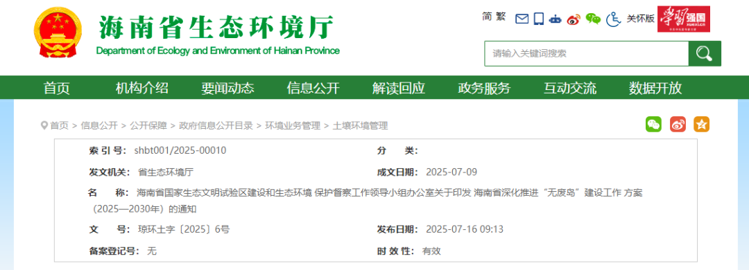 《海南省深化推进“无废岛”建设工作方案(2025—2030年)》 发布日期:2025-07-29