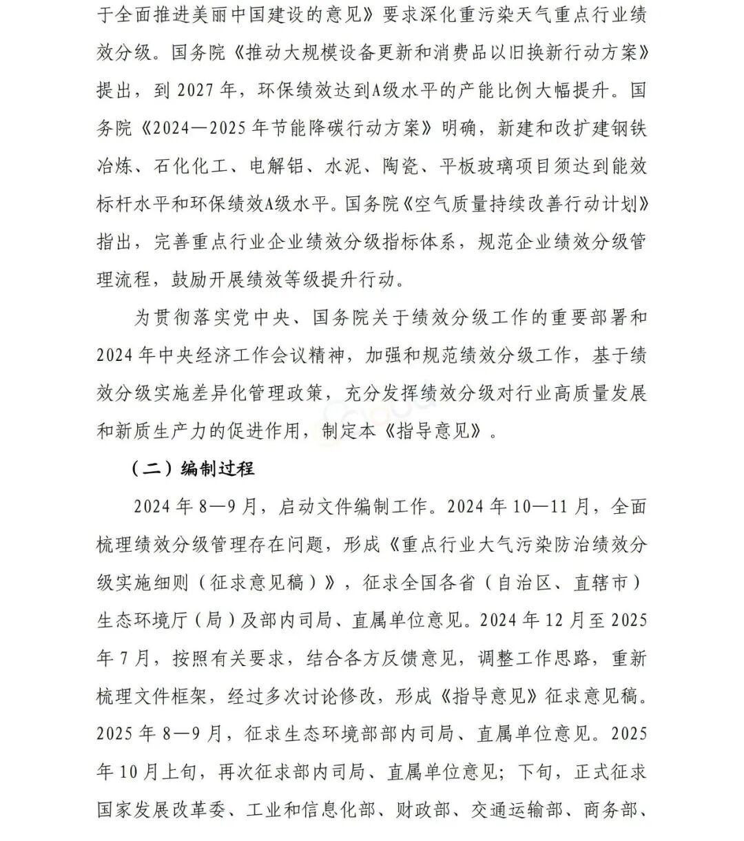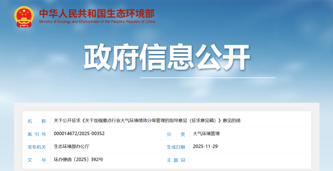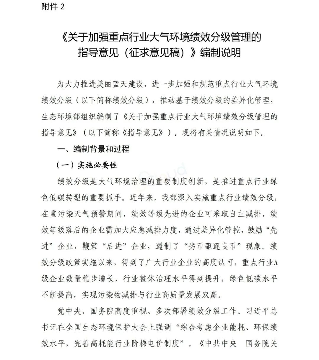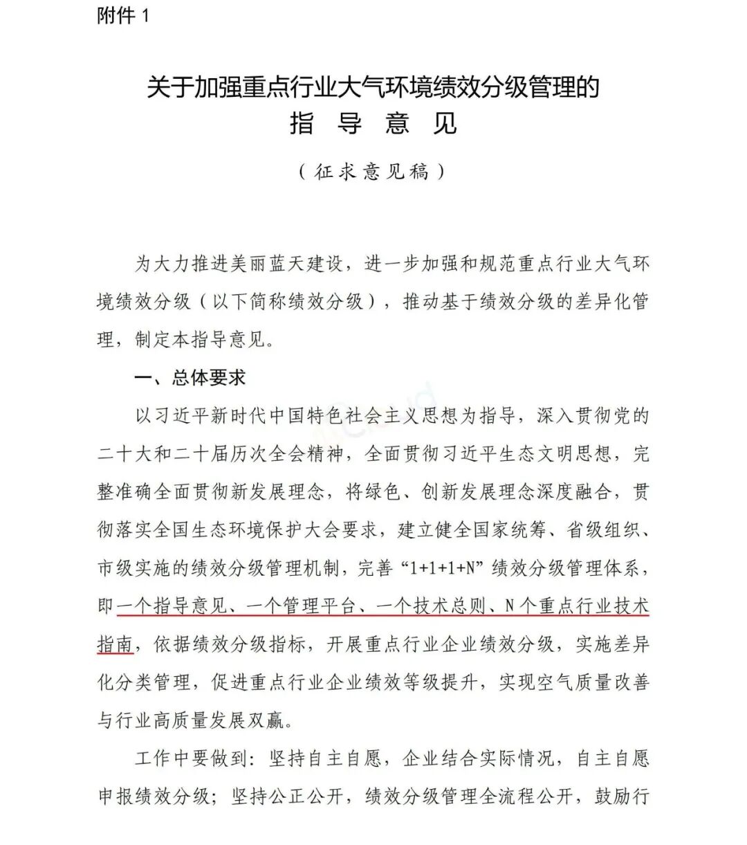 为深入推进美丽蓝天建设,进一步加强和规范重点行业大气环境绩效分级管理,推动绩效分级结果多场景应用,促进重点行业绿色低碳转型和高质量发展,我部组织编制了《关于加强重点行业大气环境绩效分级管理的指导意见(征求意见稿)》,现公开征求意见。征求意见稿及其编制说明可登录生态环境部网站(.cn)“意见征集”栏目检索查阅。