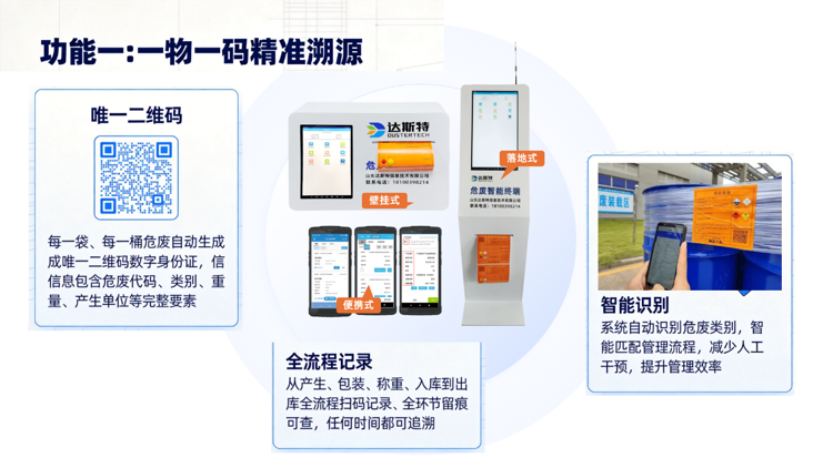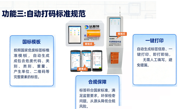 在危废管理数字化浪潮中,功能是否硬核、效率是否领先、是否真正解决问题,是评判智能终端价值的核心标准。山东达斯特危废智能终端凭借一物一码、智能称重、自动打码、台账直报四大核心功能,成为行业效率标杆,帮助企业把复杂变简单、把繁琐变自动、把风险变安全。