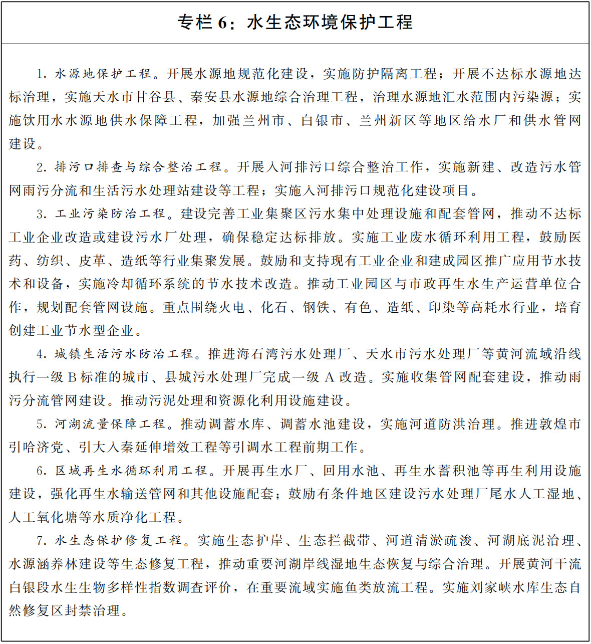 将再生水纳入城市水资源配置,按照“优水优用,就近利用”的原则,建立应用则用、效益最优、因地制宜的再生水调配体系。在重点排污口下游、支流入干流处等关键节点因地制宜建设人工湿地水质净化等工程设施,对处理达标后的排水和微污染河水进一步净化改善后,纳入区域水资源调配管理体系,用于区域内生态补水、工业生产和市政杂用。依托季节性河道和低洼地带,因地制宜建设再生水调蓄库塘,形成合理的再生水调蓄能力,确保利用能力与调蓄能力相匹配。鼓励嘉峪关、金昌、酒泉、张掖、庆阳、定西等地级缺水城市和兰州、白银、兰州新区积极开展区域再生水循环利用试点示范。积极推动再生水、雨水和苦咸水等非常规水源利用,建设一批再生水利用调蓄水池,逐步普及城镇建筑中水回用技术。