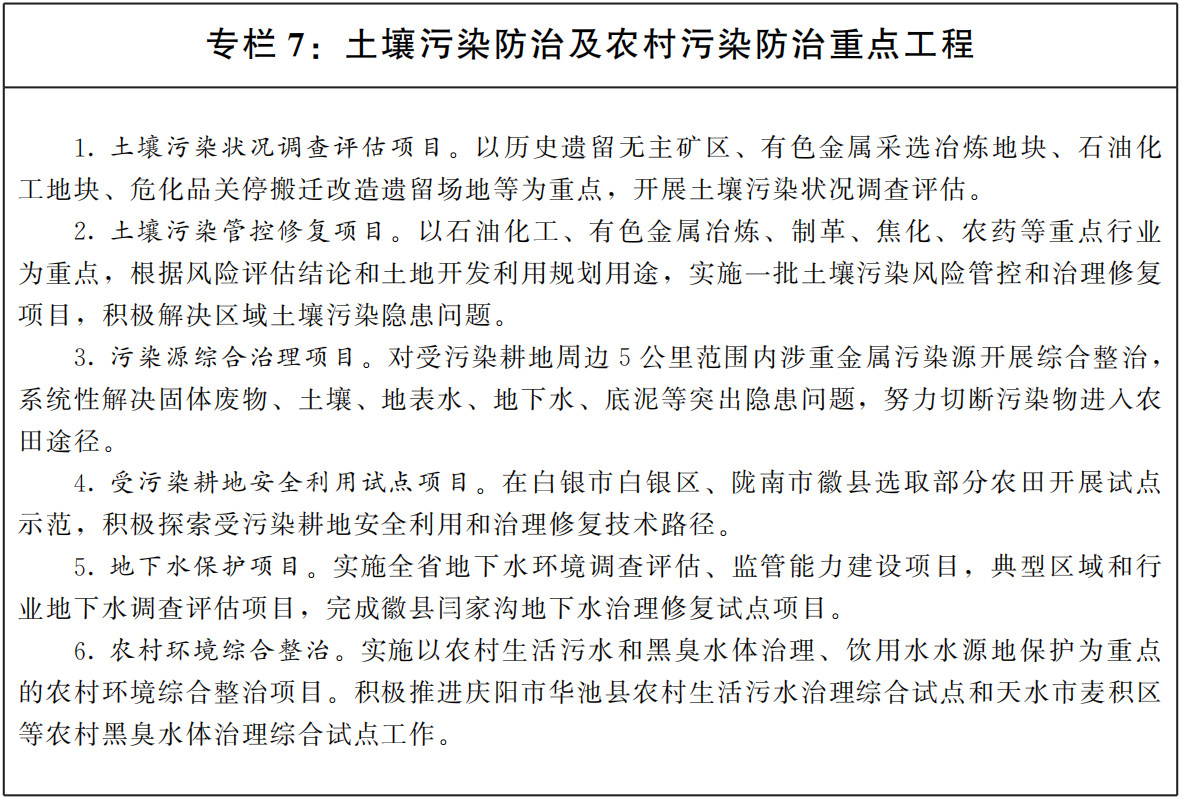 贯彻落实《工矿用地土壤环境管理办法(试行)》,每年更新发布土壤污染重点监管单位名单,督促重点单位落实土壤环境自行监测、隐患排查、有毒有害物质使用排放情况报备等工作,不断提高重点工业企业土壤污染防治水平。继续开展固体废物堆存场所和非正规垃圾堆存点排查整治,防止污染土壤和地下水。以白银、定西、陇南、甘南等地区为重点,持续推进耕地周边涉镉等重金属行业企业排查整治,努力切断重金属污染源进入农田途径。