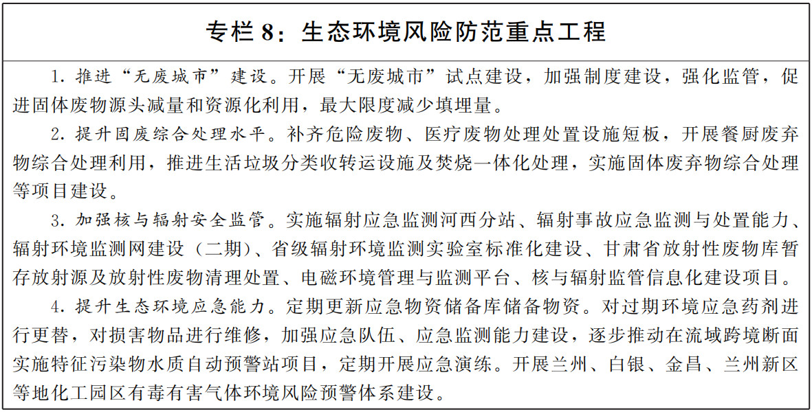 完善突发环境事件应急预案体系,修订《甘肃省突发环境事件应急预案》,督促县级以上政府环境保护主管部门全面完成突发环境事件应急预案修编,实施企业环境应急预案电子化备案,推动涉危涉重企业电子化备案全覆盖。加强重点流域环境风险综合管控,系统构建流域应急响应“一河一策一图”,选择跨界典型河流建立完善应急响应方案。健全省、市、县三级联动应急响应机制,加强环境应急物资储备库、应急队伍、应急监测和预警能力建设,完善重点环境风险源、环境敏感目标、应急救援能力等基础数据库,推进跨区域、跨部门、跨流域突发环境事件应急协调联动,开展常态化应急演练。