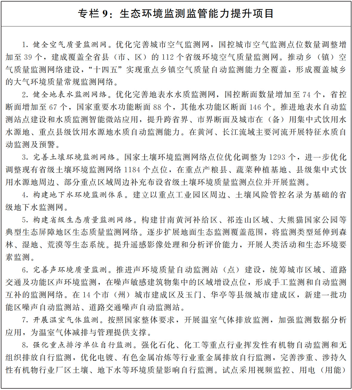 建立完善天地一体、上下协同、信息共享的生态环境监测网络,优化监测站点布局,努力实现环境质量、生态质量、污染源监测全覆盖。提升空气质量预警预报能力,探索推进水环境质量预警预报业务和技术体系建设。加强部门协同,完善激励惩戒机制,强化生态环境监测机构监管,推动建立健全以内部质量控制为主、外部质量监督为辅的质量管理制度,确保监测数据“真、准、全”。持续推动省市县监测机构能力建设,制定出台基层监测机构标准化建设指导意见。2025年前,全省县(市、区)环境监测站具备独立开展行政区域内执法监测和应急监测能力。