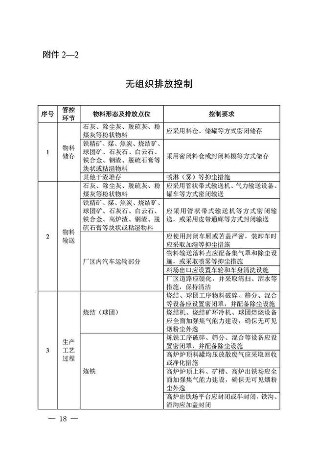 2.无组织排放控制措施。全面加强物料储存、输送及生产工艺过程无组织排放控制,在保障生产安全的前提下,采取密闭、封闭等有效措施,有效提高废气收集率,产尘点及车间不得有可见烟粉尘外逸。无组织排放控制及措施的界定见附件2—2、附件2—3。