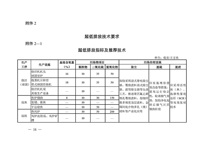 1.有组织排放控制指标。烧结机机头、球团焙烧烟气颗粒物、二氧化硫、氮氧化物排放浓度小时均值分别不高于10、35、50毫克/立方米;其他主要污染源颗粒物、二氧化硫、氮氧化物排放浓度小时均值原则上不高于10、50、200毫克/立方米,具体指标限值见附件2—1。达到超低排放的钢铁企业每月至少95%以上时段小时均值排放浓度满足上述要求。